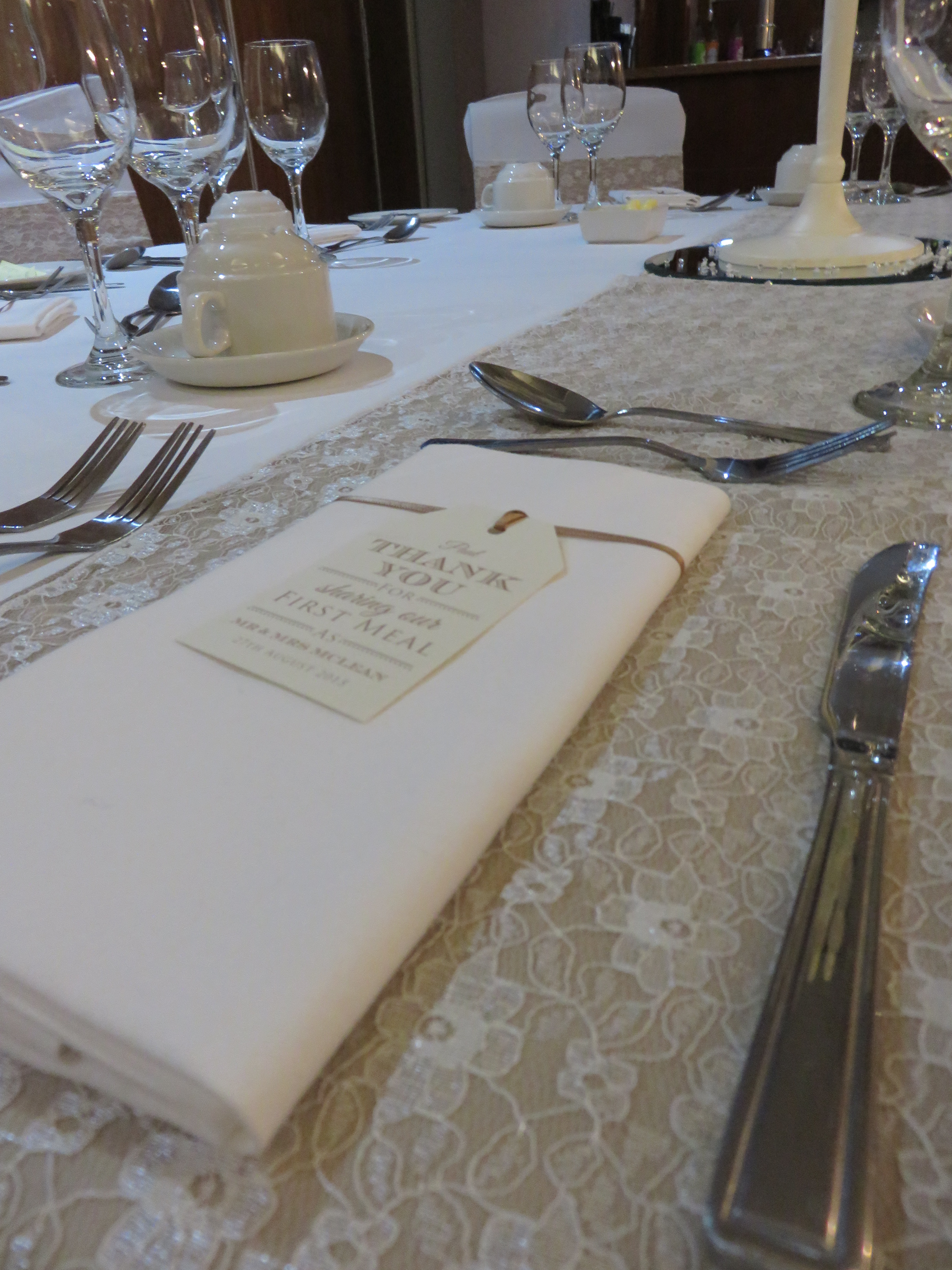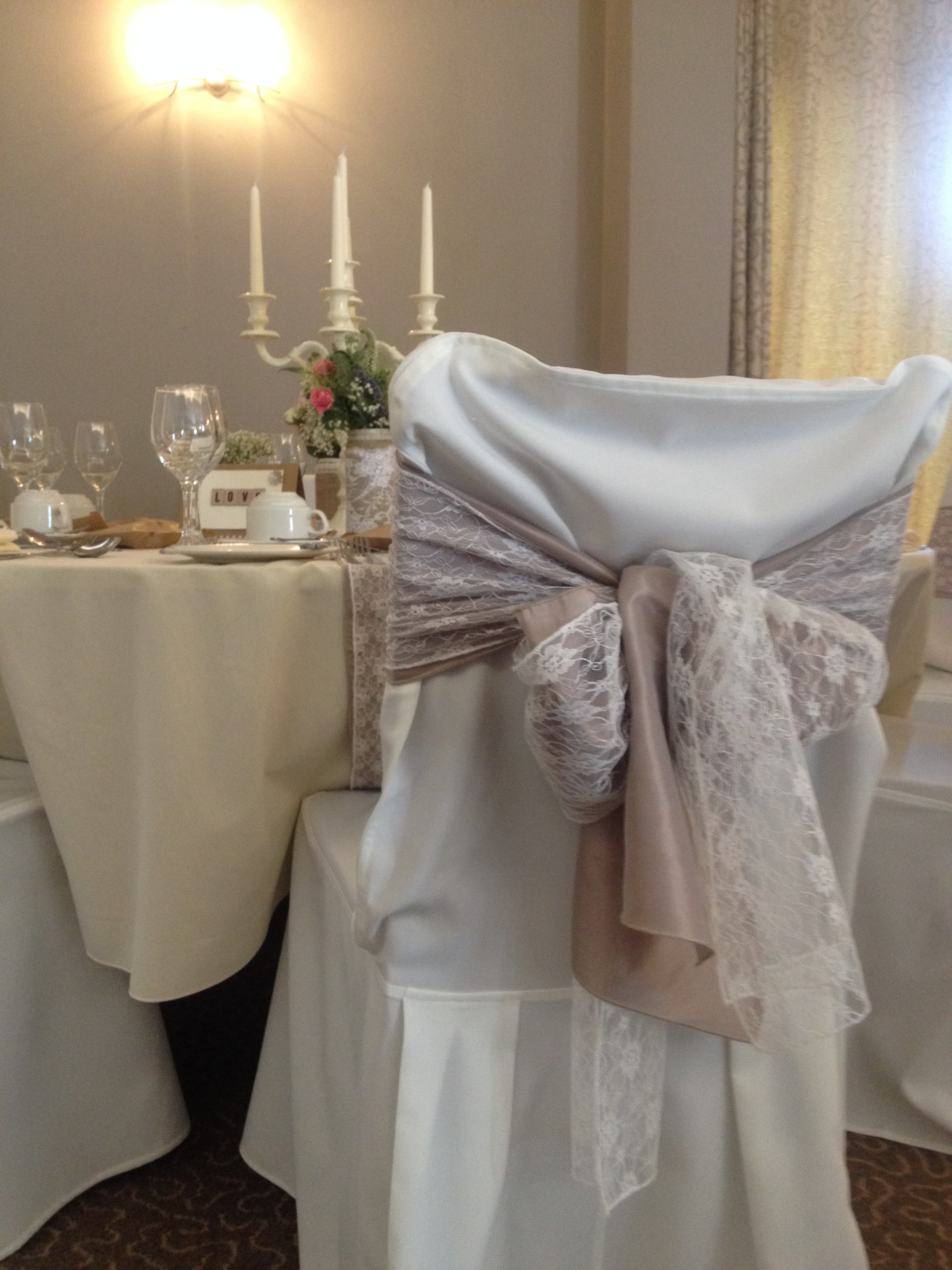 1. Age your venue with carefully placed, charming decoration – antique detailing on a few items, a touch of lace, and weathered accents go a long way to creating that vintage/decade feel! Let your venue define your style. Some places suit certain vintage décor better than others so let the room do the talking! For example, if you’re having your vintage reception in a ballroom, 1920s art deco would be perfect! Hosting the wedding breakfast in a barn? Rustic, lace and hessian work their charm best! Whereever the venue, a simple touch not only adds a period feeling but simply oozes romance! This hessian/lace tablerunner, spotted at one of the wedding breakfasts held in Smiths at Gretna Green, set the room perfectly for this reception tying together the timeless atmosphere created by flowers and accessories placed around the room.